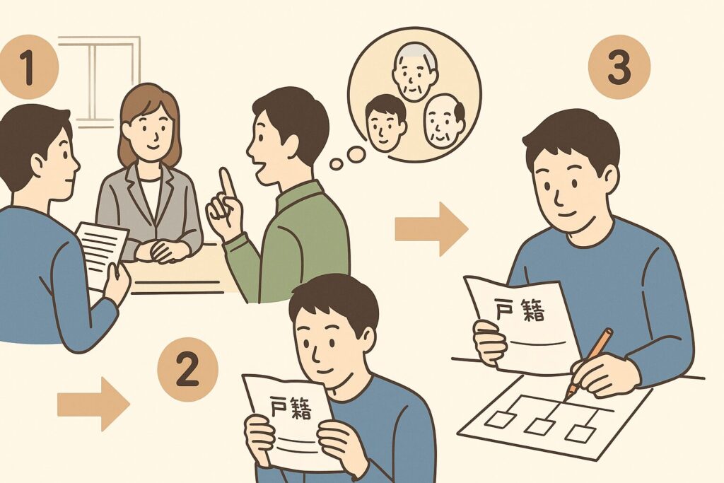 自分で戸籍たどり、必要に応じて追加の戸籍謄本を取得。 - 家系図にまとめる